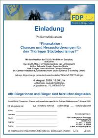 Podiumsdiskussion im Augustinerkloster Erfurt (Augustinerstraße 10,99084 Erfurt), "Wirtschaftskrise - Chance und Herausforderung für den Thüringer Städtetourismus", Teilnehmer u.a. Uwe Barth, MdB, Dr. Zumpfort (Direktor TUI), Jürgen Lange (LFA-Leiter Wirtschaft), Dirk Ellinger (Dehoga), Lothar Schmelz (Kurator Augustinerkloster), Dr. Carmen Hildebrandt (Erfurt Tourismus & Marketing GmbH)