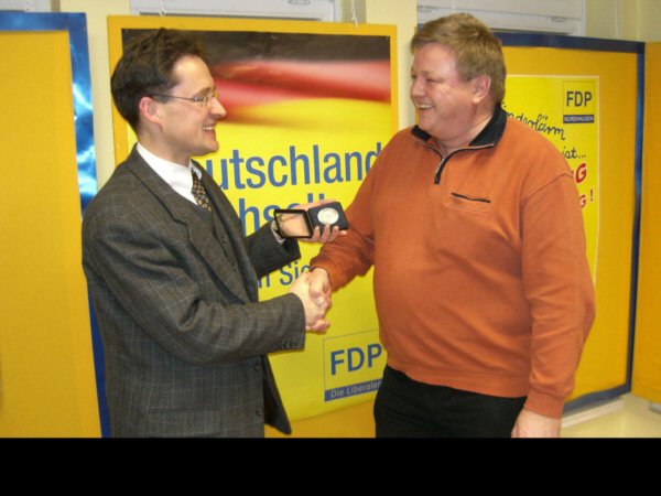 Auf der letzten Sitzung des FDP-Kreisverstandes konnte der Vorsitzende Claus Peter Roßberg eine angenehme Aufgabe erledigen. Er überreichte Andreas Klaschka für seine 25-jährige Mitgliedschaft bei den Liberalen die Theodor-Heuss-Verdienst-Medaille. Gewürdigt wird damit seine langjährige aktive ehrenamtliche Tätigkeit.